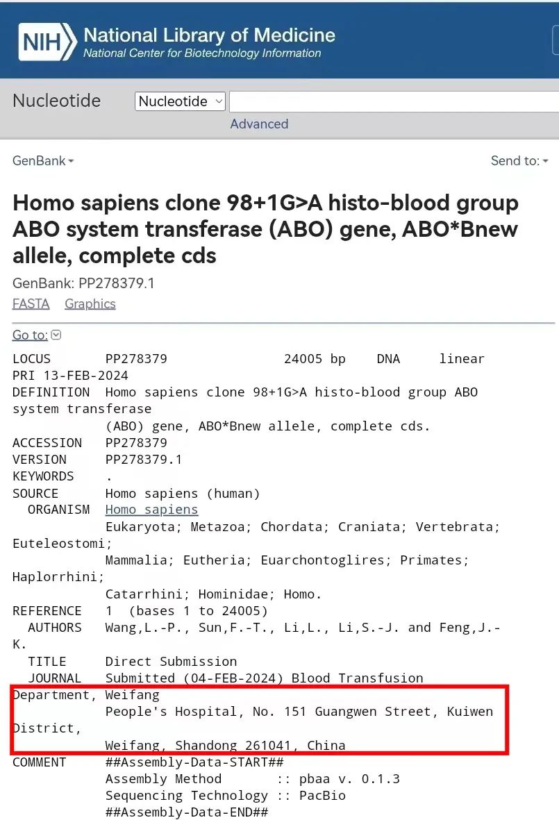 鲁网2月18日讯 2024年2月14日,潍坊市人民医院输血科发现的首例abo血型系统b亚型新基因被国际genbank数据库收录并公布。核酸序列号为:pp278379。
