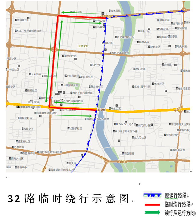 32路顺行方向:车辆从潍坊输油处(奎文基地)发车,沿原线路运行至和平路东风街路口后,沿东风街-向阳路-北宫街东行恢复原线运行。不再运行和平路(北宫街-东风街)路段。