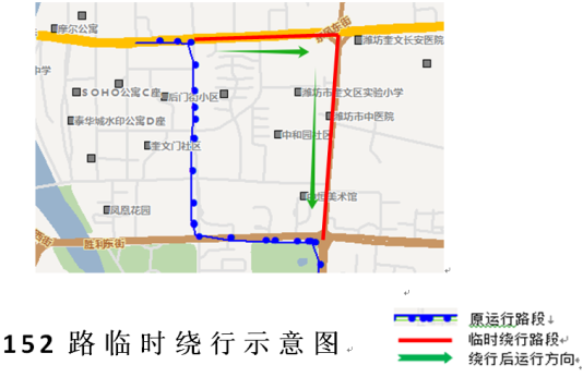 152路(夜经济专线)上行方向:车辆从泰华城发车,沿原线运行至东风街四平路路口后,沿东风街-潍州路南行恢复原线运行,不再运行四平路(东风街-胜利街)、胜利街(四平路-潍州路)路段。