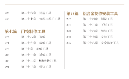 《中国传统民间制作工具大全》第一卷,共计八篇,包括:工具溯源,瓦匠工具,砖瓦烧制工具,铜匠工具,木匠工具,木雕工具,锔匠工具,给水排水工和暖通工工具。