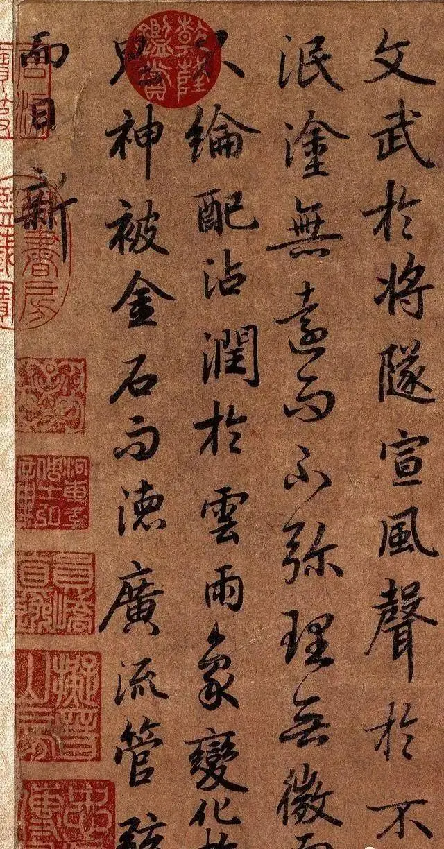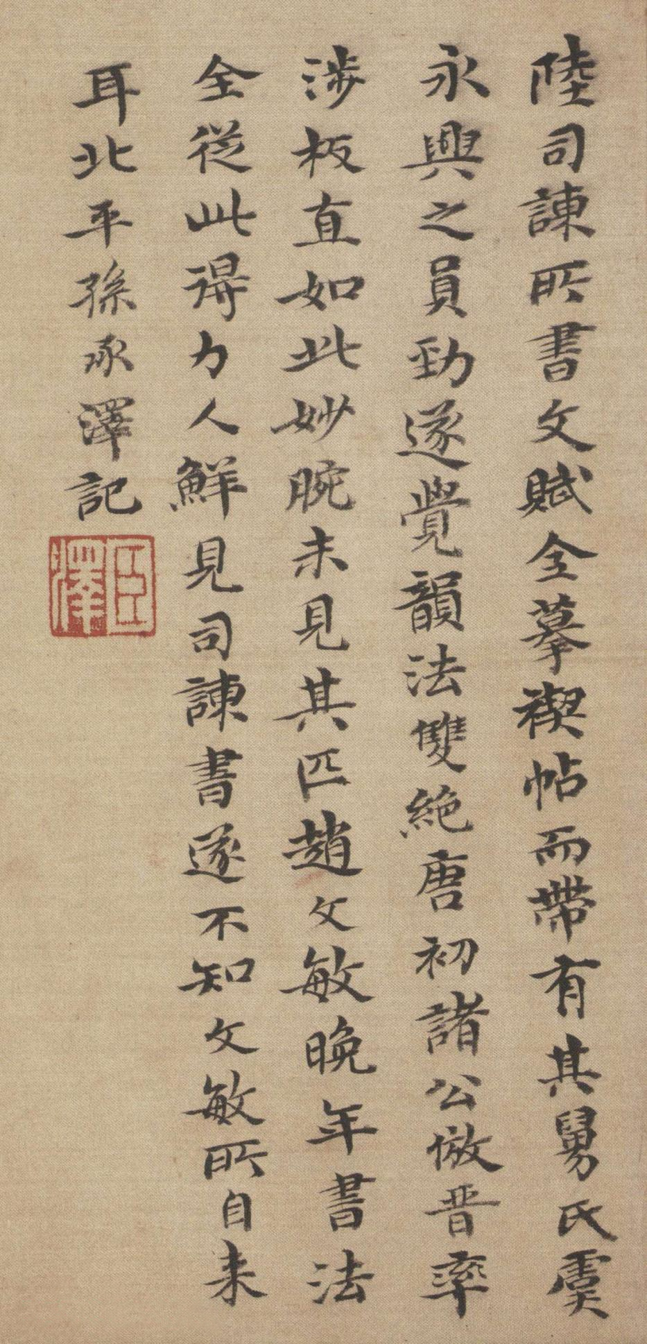 在唐代有一位书法界的“一哥”,他是虞世南的外甥,也是“草圣”张旭的外祖父,他就是大书法家陆柬之。陆柬之的这件《文赋》现藏于台北故宫博物院,乃是著名的“国宝级书法”,婉媚遒劲,结体温雅,笔法飘纵,艳媚动人,此作因为太过珍贵而到现在依旧被禁止出境展览。而孙承泽在其上题跋近百字,还盖了“孙氏”章,可见他对此书法的喜爱和推崇。