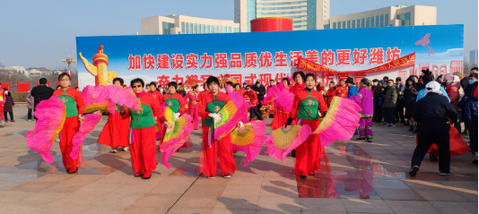 现场锣鼓声、秧歌声、扇子舞、腰鼓舞、划旱船……一场场表演绘就了生动的民俗画卷,为广大市民奉上一场热闹欢腾的文化盛宴。秧歌队伍身着鲜艳的服装,欢快的节奏让人不由自主地跟着起舞。扇子舞表演者们或蜻蜓点水,或雄鹰展翅,舞姿翩翩。腰鼓舞表演者们激情四溢,豪放自如,鼓声激昂、催人奋进。