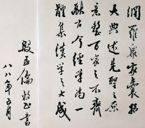 在登记表里,我看到了山东大学殷孟伦(1908—1988)先生,他是中国训诂学研究会创会第一副会长。上世纪30年代,老殷先生考入南京中央大学读本科并留校,跟随黄侃先生学习了六年,1935年去日本东京帝国大学做研究生,师事汉学家盐谷温先生。讨论会召开时他过了80周岁,身体不佳;会议合影没有他,唐文4月6日致徐超信也说计划5月21日会议结束后去济南拜访老殷先生。而弟子徐超先生记得去了高密火车站接老殷先生。究竟与会与否?直到我到了潍坊富华大酒店,看望并求证于老殷先生另一位弟子吴庆峰教授,才确认无疑:老殷先生坚持要与会,由弟子搀扶,颤颤巍巍,乘绿皮火车到达高密,错过了会议合影,但留下了亲笔题辞:“网罗众家,囊括大典;述先圣之原意,整百家之不齐;融古今经学于一体,集汉学之大成。”老殷先生七个月后的12月14日溘然长逝,这是他生前最后一次重要学术会议。“郑玄文化宣传推介活动”今天隆重发布的《郑玄全集》,其辑校者吴庆峰先生和王其和教授,是优秀的训诂学者,先后任中国训诂学研究会理事,也是老殷先生的得意弟子和再传弟子,薪尽火传。