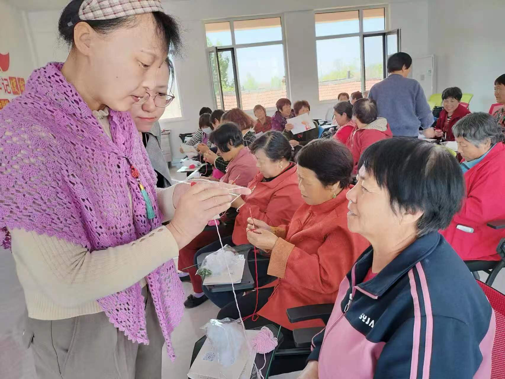 临朐县基层文化建设指导员、临朐钩针编织技艺代表性传承人张存梅手把手指导村里的妇女们练习基础针法。