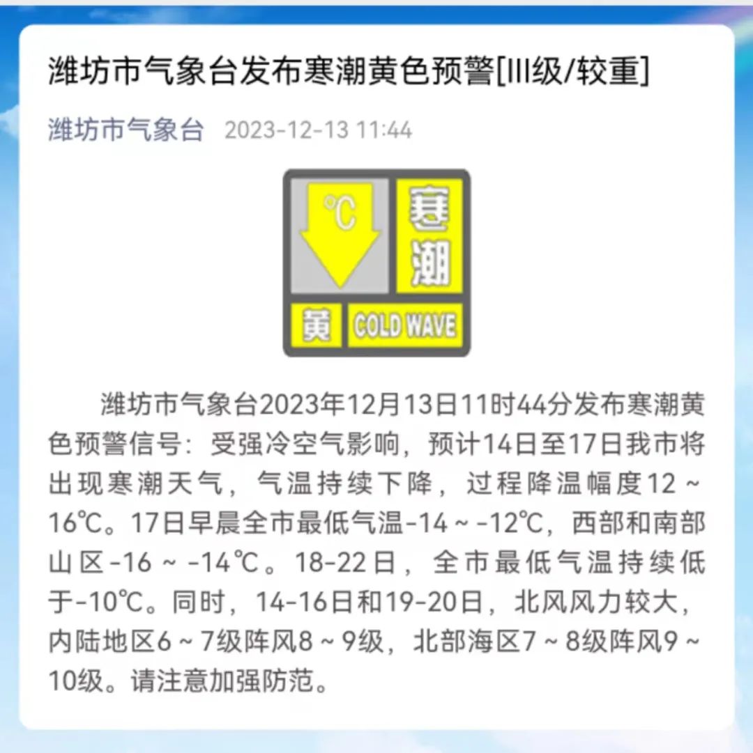 12月13日,潍坊市气象台发布寒潮黄色预警和道路结冰黄色预警。